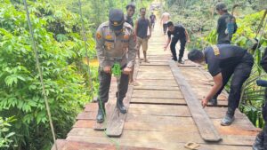 Dalam percepatan perbaikan jembatan tersebut, Senin (9/3/26), agenda yang dilakukan oleh personil Polri yaitu melaksanakan pekerjaan pengeboran papan lantai dan langsung memaku Papan Kayu Ulin yang digunakan untuk lantai jembatan gantung Sakuyah tersebut.